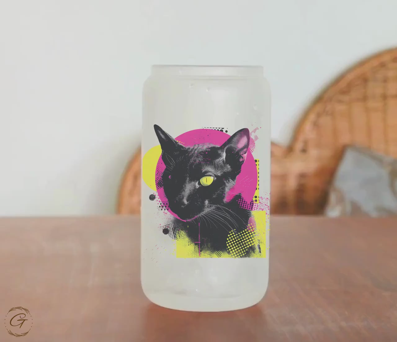This trendy frosted glass cup features a unique cat lover design. Perfect for enjoying your iced coffee or any cold beverage, this Libbey glass can adds a modern touch to your drinkware collection. With its stylish cat art, it's a great gift for feline enthusiasts or a charming addition to your own collection. Durable and visually striking, this frosted glass tumbler is sure to stand out.