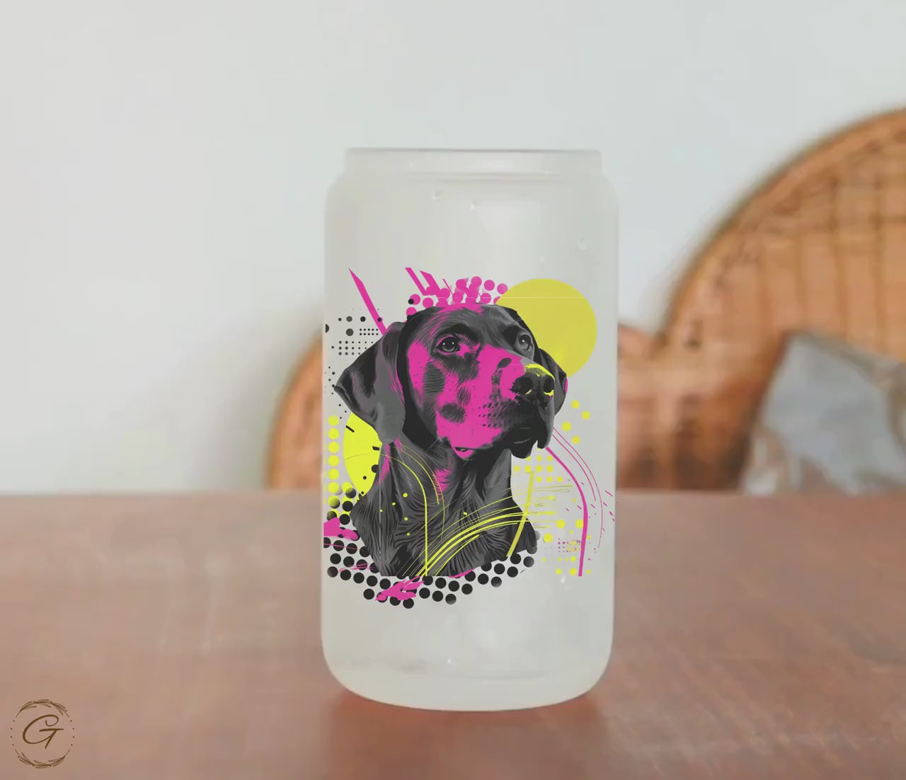 This vibrant and unique frosted glass cup features a stunning dog design. Perfect for dog lovers, this Libbey Cup is ideal for iced coffee or beverages of your choice. The colorful dog art adds a touch of whimsy and style to your drinkware collection, making it a great gift for any dog enthusiast.