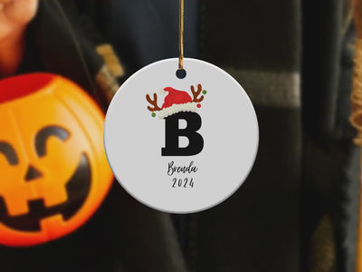 Festive Christmas Initial Name Ornament Santa Hat and Reindeer, Holiday Decoration Keepsake, Merry Christmas Celebration, Holiday Gift Ideas