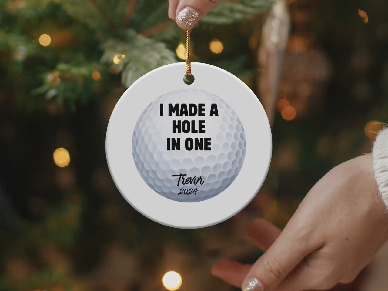 Commemorate your incredible golfing achievement with this Hole in One Celebration Ornament. This special keepsake is perfect to celebrate the memorable moment of scoring a hole-in-one. Ideal as a gift for avid golfers or as a unique golfing trophy to display proudly. Make your golf gift even more special with this custom ornament, which adds a personal touch to any golfer's collection.