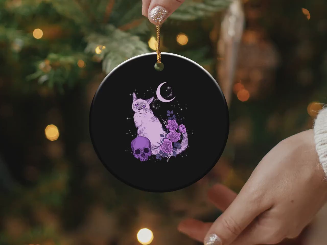 This gothic cat art ornament features a mystical design with a purple cat under a crescent moon, adorned with roses and a skull. Perfect for adding a touch of magic to your home or as a unique Halloween decor piece. Ideal gift for lovers of witchy aesthetic and mystical themes.