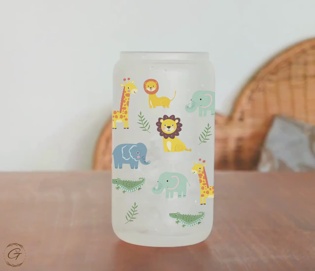 Discover our charming frosted glass cup featuring adorable jungle animals like giraffe, lion, elephant, and alligator. Perfect for adding a fun touch to your drinks, this glass can tumbler is ideal for iced coffee enthusiasts. Make your beverage time delightful with this cute and sturdy glass.