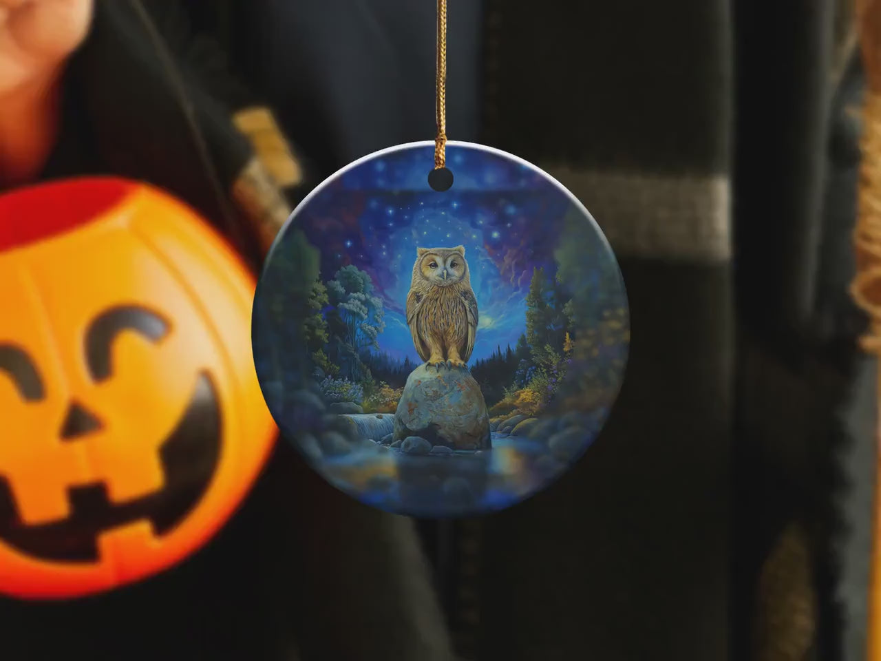 This handcrafted owl ornament features a stunning night sky background with an intricately detailed owl perched on a rock. The vivid artwork showcases a beautiful forest setting, making it a unique addition to any nature or wildlife decor collection. Ideal for nature enthusiasts, this piece adds a touch of woodland magic to any room. Perfect for gifting or enhancing your own home decor, this owl ornament is sure to captivate and inspire.