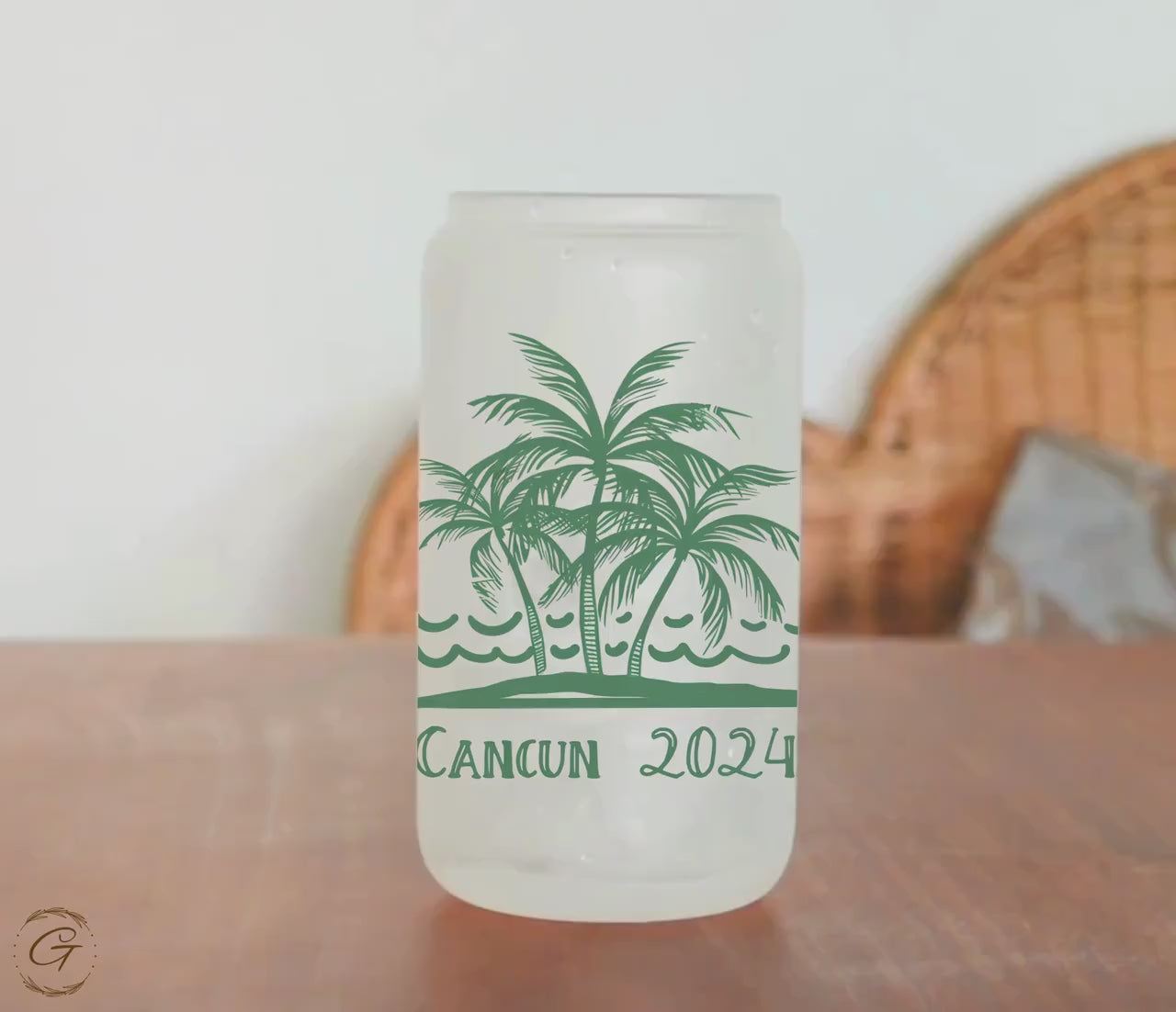 Featuring a stunning design of exotic palm trees and the text "Cancun 2024," this cup is also customizable with any name. This personalized frosted glass cup is the perfect souvenir for a memorable beach vacation. It's an exceptional keepsake for commemorating a tropical holiday or a unique gift for friends and family. Relive the relaxation and beauty of Cancun with every use of this elegant glass cup. Ideal for any occasion, especially for lovers of sun, sand, and sea.