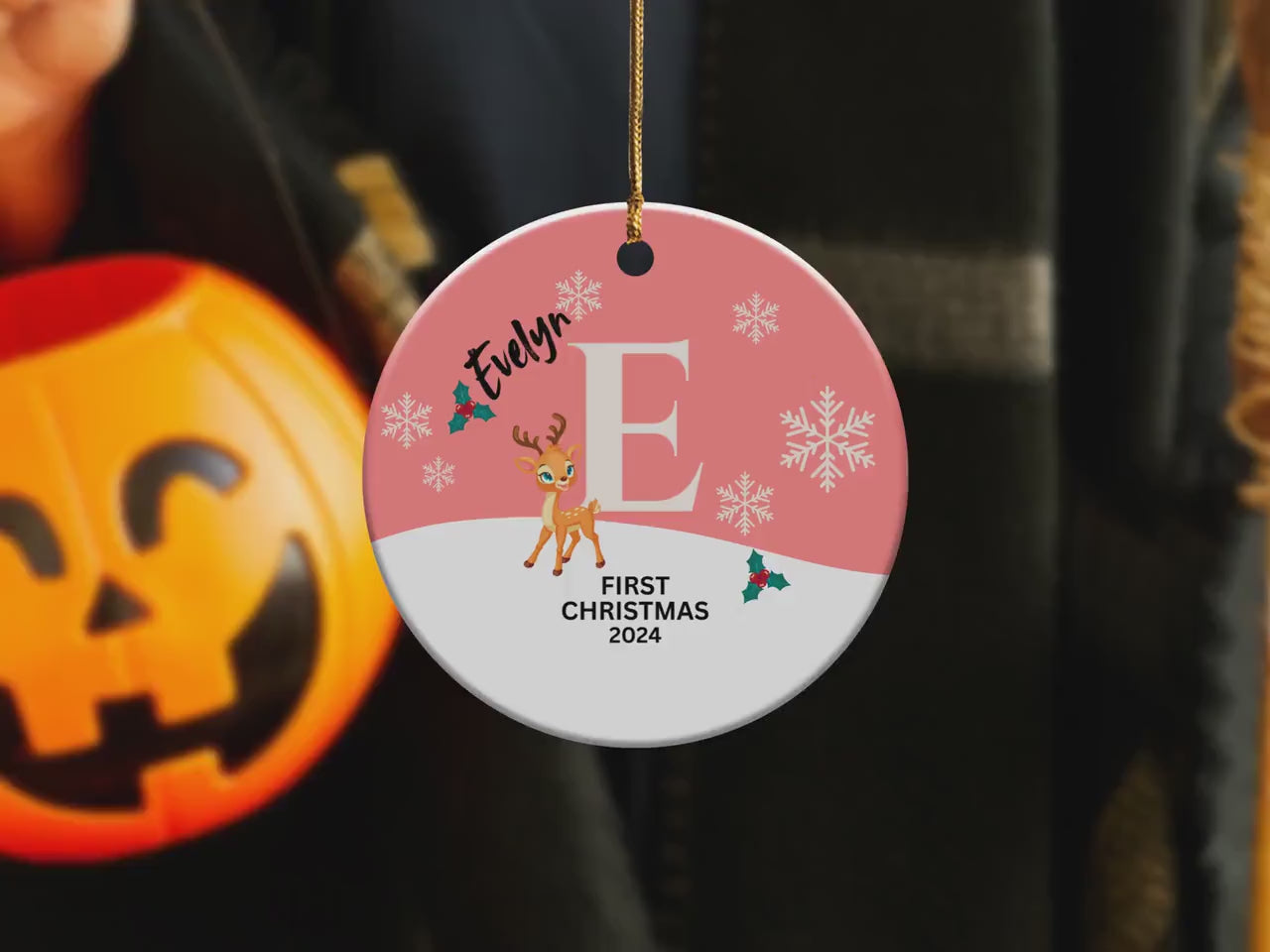 Celebrate your baby's first Christmas with this adorable personalized ornament! Featuring a cute reindeer and snowflakes, this custom decoration is perfect for commemorating your little one's first holiday season. The ornament displays the baby's name and the year 2024, making it a precious keepsake to cherish for years to come. It's the perfect addition to your Christmas tree or as a thoughtful gift for new parents.