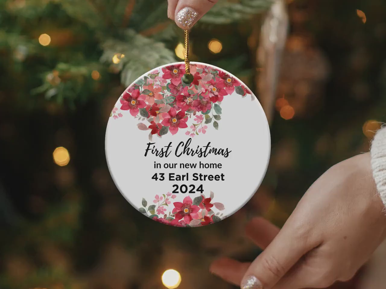 Celebrate your first Christmas in your new home with this beautiful personalized ornament. Featuring a charming floral design, it’s a perfect keepsake to remember the special occasion of 2024 at 43 Earl Street. Ideal for adding a unique touch to your holiday decorations or for gifting to loved ones moving into a new home. This custom ornament will be cherished for years, marking your unforgettable first holiday season together.