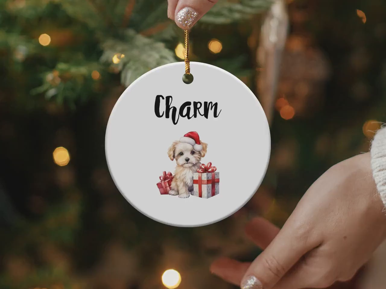 Add a touch of holiday charm with this adorable puppy ornament. Featuring a cute puppy wearing a Santa hat and surrounded by festive gifts, it's perfect for your Christmas tree or as a delightful gift. Enhance your holiday decorations with this cute and festive puppy keepsake.