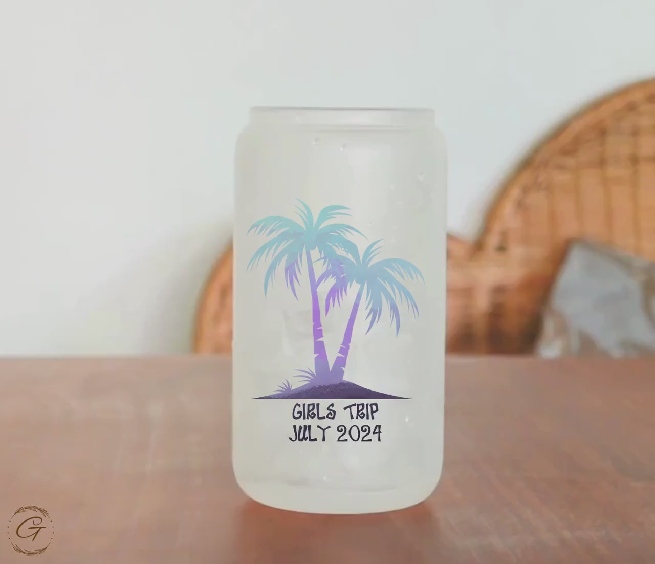 This personalized frosted glass cup is perfect for commemorating special occasions like girls trips or bachelorette parties. Featuring a stylish island palm trees design, you can customize it with a name and date for an extra special touch. This durable and stylish cup is an ideal gift that your friends will cherish for years to come. Make every sip special with this unique and thoughtful gift!