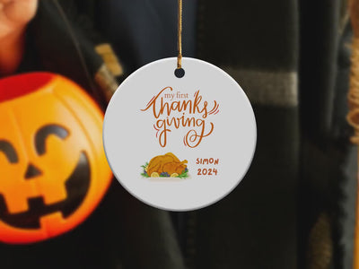 Celebrate your baby's first Thanksgiving with this adorable personalized ornament. This ornament is a wonderful keepsake for your little one's first holiday season. Perfect for decorating the Christmas tree or as a special gift for new parents. Cherish this sweet moment with a customized ornament that captures this milestone.
