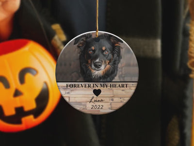 This memorial ornament is a beautiful tribute to your beloved pet. Featuring a detailed dog portrait and the phrase "Forever in My Heart," this custom pet photo ornament is perfect for remembering your furry friend during the holidays. Personalize it with your pet's name and the year 2022 to create a cherished keepsake. Ideal as a Christmas decoration or a heartfelt gift for a pet lover.
