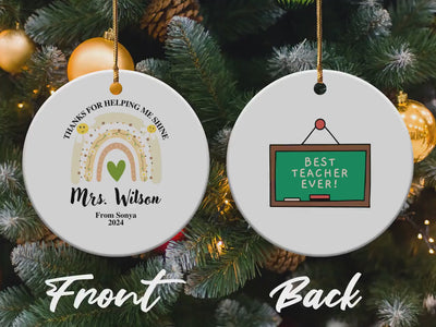 Show your appreciation with this customized ornament. Featuring "Thanks for Helping Me Shine" with the teacher's name and year. Ideal for Christmas gifts to express your gratitude.