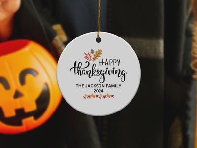 Celebrate the holiday season with this beautiful Thanksgiving ornament. This personalized keepsake features autumn leaves and can be customized with any family name and year. Perfect for adding a special touch to your holiday decor or as a thoughtful gift for friends and family. Makes a great addition to your Thanksgiving traditions for years to come.