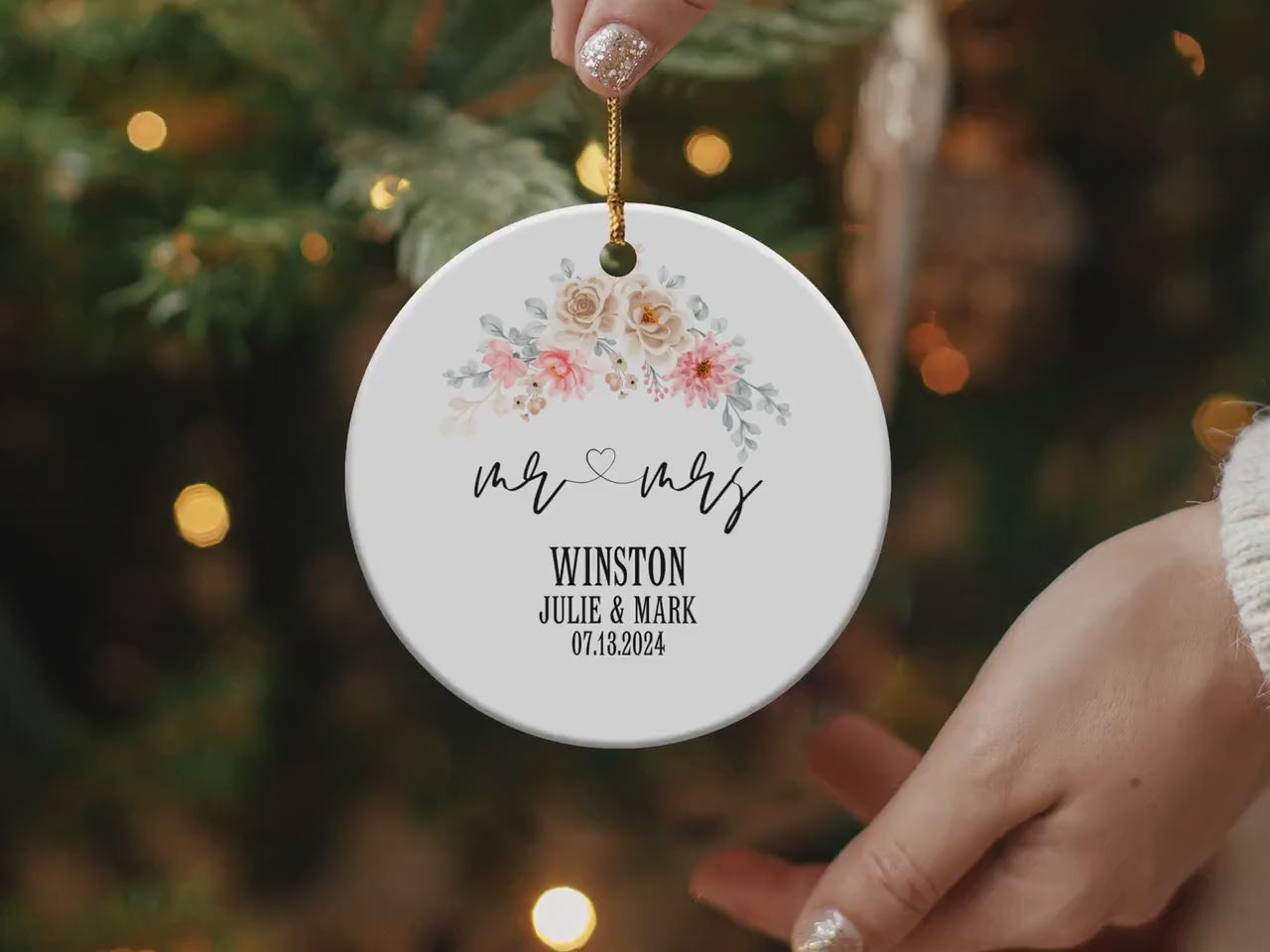Celebrate your special day with this personalized wedding ornament featuring Mr and Mrs with your names and wedding date. Adorned with delicate floral designs, it makes a unique bridal shower gift and a memorable keepsake for the newlyweds. Perfect for adding a personal touch to your 2024 wedding decor. Hang it on your tree or display it as a reminder of your love and commitment.