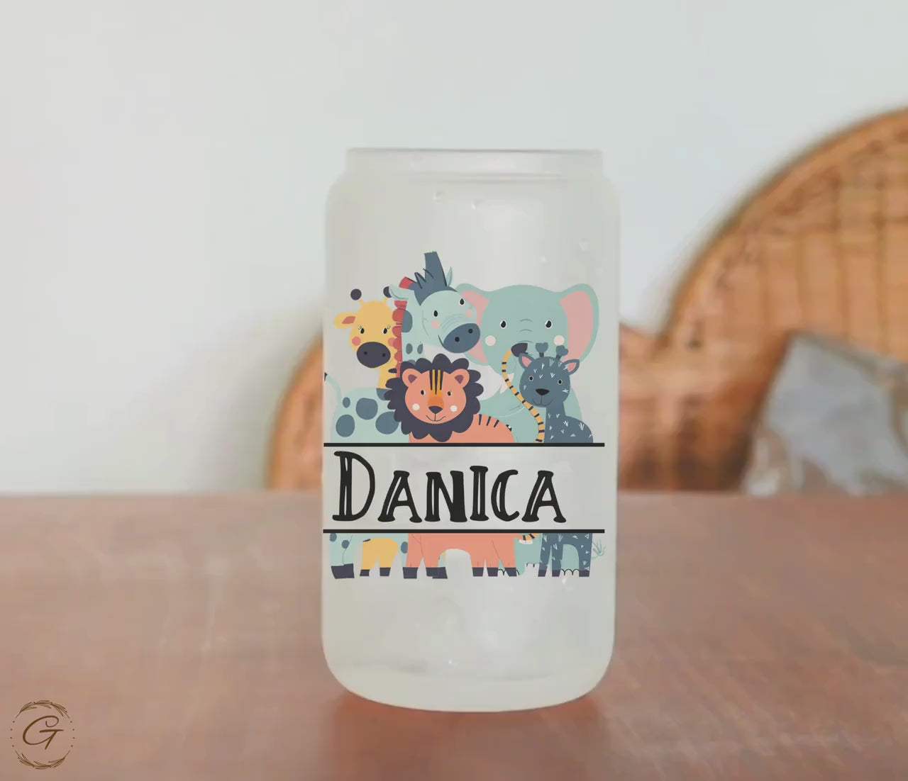 This adorable frosted glass cup features a cute safari animal design, perfect for kids! Customizable with any name, it makes a great personalized gift. Suitable for iced coffee, juice, or any beverage, this charming glass can is both fun and functional, making it a unique addition to any drinkware collection.