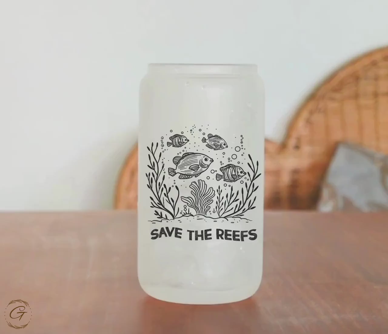 Celebrate and support marine life with this frosted glass cup featuring an illustration of underwater sea life and 'Save the Reefs' message. Perfect for iced coffee, this eco-friendly glass can is ideal for ocean lovers and conservationists. Enhance your drinkware collection and show your commitment to saving marine ecosystems. Great for any occasion or as a thoughtful gift.