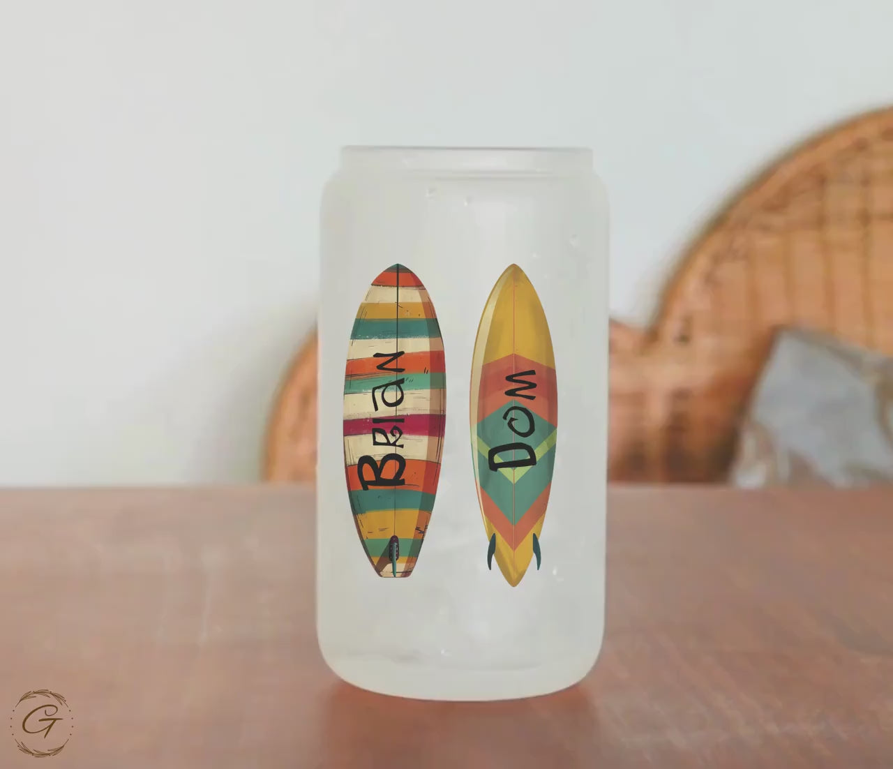 Enjoy your favorite beverages in style with this Frosted Glass Cup featuring a colorful surfboard design. Perfect for surfing enthusiasts, this Libbey Cup is ideal for iced coffee, smoothies, or any cold drink. The vibrant "Surf Buddies" design adds a retro touch, making it a great addition to your glassware collection or a unique gift for friends who love the beach. This durable glass can or tumbler ensures a refreshing drinking experience every time.