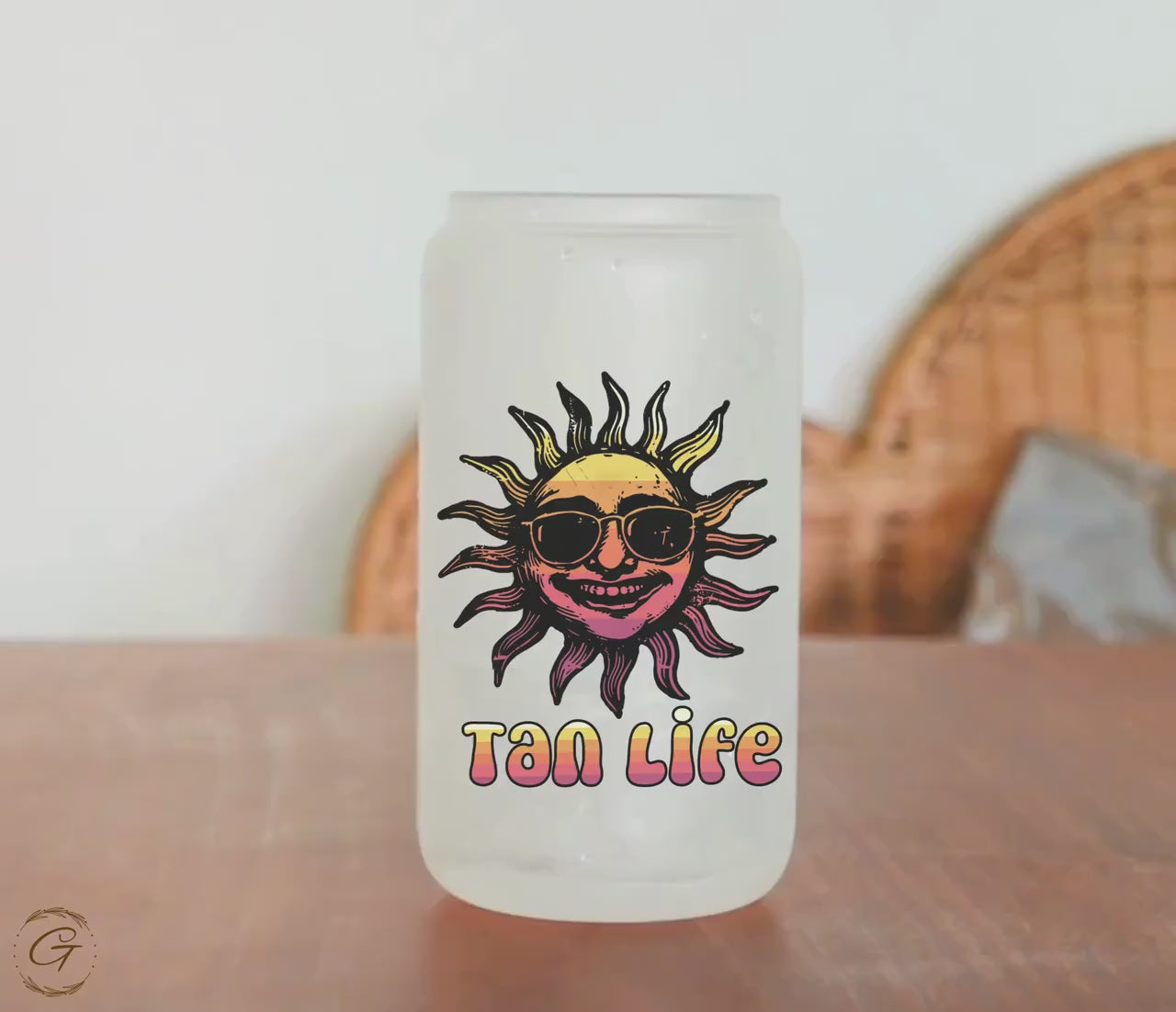 Elevate your beverage experience with this unique frosted glass cup featuring a vibrant "Tan Life" sun design. Perfect for iced coffee or any drink, this Libbey cup is not only functional but also adds a fun and stylish touch to your kitchen or outdoor gatherings. Show off your love for sunny vibes and stay grateful with this eye-catching tumbler. Ideal for summer parties, beach trips, or just enjoying a refreshing drink at home.