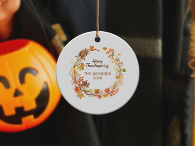 Celebrate the fall season with this beautiful Thanksgiving wreath ornament! Perfect for adding a personalized touch to your Thanksgiving decor, this customizable ornament features an elegant wreath design with the option to include your family's name and the year. It's a charming addition to your autumn decorations and makes a wonderful keepsake for years to come. Hang it on your wall, door, or mantle to bring a festive and warm feel to your home during the holiday season.